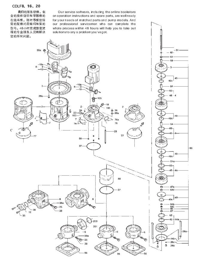 CDLF為安裝標(biāo)準(zhǔn)電機的非自吸立式多級離心泵,電機軸通過泵頭用聯(lián)軸器直接與泵軸聯(lián)接,拉桿螺栓將耐壓筒、過流部件固定在泵頭和進(jìn)出水段之間,泵進(jìn)出水口在泵底同一直線上;本泵可根據(jù)需要配置智能保護(hù)器,對泵干轉(zhuǎn)\缺相\過載等進(jìn)行有效保護(hù)。